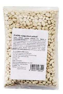 Složení: jogurtová poleva 55 % (cukr, rostlinný tuk palmový, syrovátka z mléka, rýžová mouka, jogurtový pudr z mléka 2,5 %, slunečnicový lecitin E322, arabská guma ,šelak E904), arašídy 45 %.