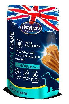 Pamlsek pro zdravé zuby psů - svačinové tyčinky Butcher´s Dental Care s kuřecí příchutí jsou doplňkovým krmivem pro dospelé psy. Balení se 180 g obsahuje středně velké tyčinky, které jsou díky své velikosti ideální pro středně velká plemena. Pamlsky pro psy dávkujte dle potřeby (nenahrazují kompletní stravu).