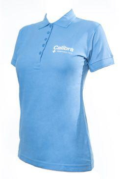 Dámské polo tričko na knoflíky s krátkým rukávem a límečkem. Na přední straně logo Calibra, záda jsou ozdobená piktogramy z korporátního vizuálu.