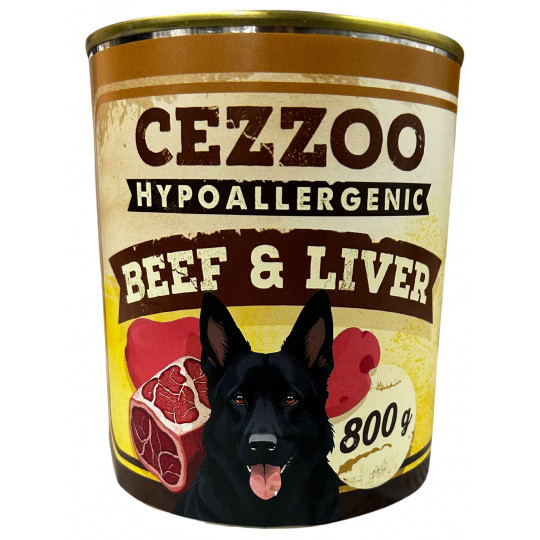 CEZZOO Hypoallergenic Beef and Liver 800g je kompletné hypoalergénne krmivo pre dospelých psov všetkých plemien s citlivým zažívaním. Obsahuje vysoký podiel kvalitného hovädzieho mäsa a pečene, ktoré sú ľahko stráviteľné a šetrné k žalúdku