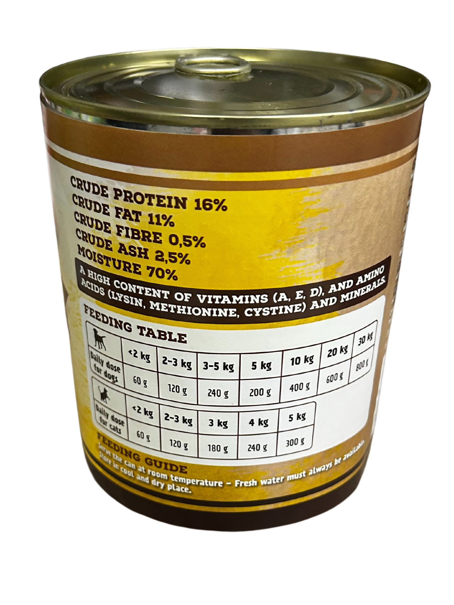 Bielkoviny 16% , Tuky 11%, Vláknina 0,5% Popol 2,5%, Vlhkosť 70%