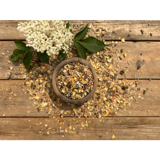 - Seno (0,5 %): Dôležitý zdroj hrubej vlákniny pre správne trávenie.