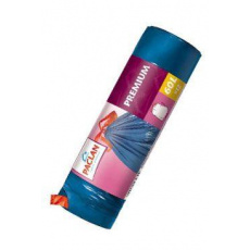 Balení 10 kusů modrých zatahovacích pytlů na odpatky s objemem až 60 l. Uchovávejte mimo dosah dětí. Ostré předměty zabezpečte.