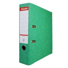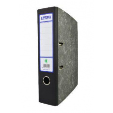 Mramorový papírový pákový pořadač se zelenými deskami a hřbetem. Formát A4. Hřbet 75 mm. hřbetní otvor uzavírací mechanismus (radozámek) kovové ochranné lišty nalepovací hřbetní etiketa