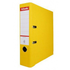 Mramorový papírový pákový pořadač se žlutými deskami a hřbetem. Formát A4. Hřbet 75 mm. hřbetní otvor uzavírací mechanismus (radozámek) kovové ochranné lišty nalepovací hřbetní etiketa