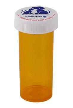 Lékovka plastová Lahvička na léky s dětským bezpečnostním uzávěrem, který je zapotřebí stlačit a otočit. Je označena logem Covetrus s dobře čitelnými pokyny k otevření a s velkou plochou pro označení. Všechny lahvičky mají na uzávěru pro větší bezpečnost siluetu psa a kočky, která slouží k označení veterinárních preparátů. Průsvitná janta