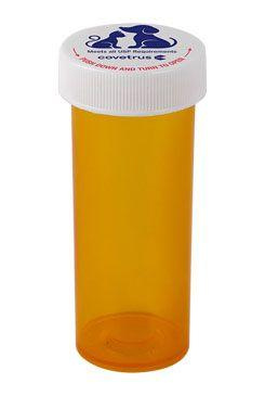 Lékovka plastová Lahvička na léky s dětským bezpečnostním uzávěrem, který je zapotřebí stlačit a otočit. Je označena logem Covetrus s dobře čitelnými pokyny k otevření a s velkou plochou pro označení. Všechny lahvičky mají na uzávěru pro větší bezpečnost siluetu psa a kočky, která slouží k označení veterinárních preparátů. Průsvitná janta