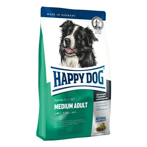 Happy Dog Supreme Fit & Well Medium Adult je vyvážené suché krmivo špeciálne určené pre stredne veľké plemená psov. Toto suché krmivo je obsahom živín prispôsobené normálnym potrebám energie stredne veľkých psov nad 21 kg do 25 kg. Ako bezlepkové krmivo je Medium Adult znamenite vhodnou potravou pre labužníkov a „citlivky“. Lahodná hydina, jahňacina a cenné bylinky robia z produktu Supreme Fit & Well Medium Adult veľmi dobré a vyvážené suché krmivo pre psov, vhodné aj pre psov s alergiami alebo potravnou neznášanlivosťou. Obsah energie a veľkosť granúl sú napasované špeciálne na stredne veľké plemená psov.