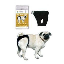 Materiál kalhotek je zvolený pro časté ruční praní. Kalhotky nesmí fenu obtěžovat, proto je obvodový lem pružný, zapíná se na kovovou sponu. Jen správná velikost kalhotek zajistí jejich funkčnost.