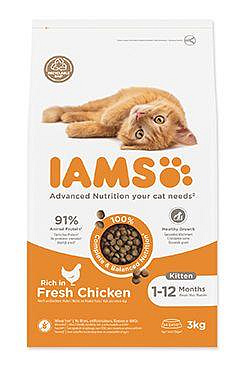 Krmivo IAMS for Vitality pro koťata je 100% kompletní a vyvážené, odborníky sestavené krmivo, které bude zvířeti chutnat a svědčit. Naše nová a vylepšená receptura pro koťata s čerstvým kuřecím masem je založena na kvalitních živočišných bílkovinách pečlivě vybraných tak, aby podporovaly sedm znaků zdravé vitality koťat. Aby byla koťata zdravá, aktivní a plná energie, obsahují naše lahodné receptury až 91 % živočišných bílkovin (z celkového obsahu bílkovin).