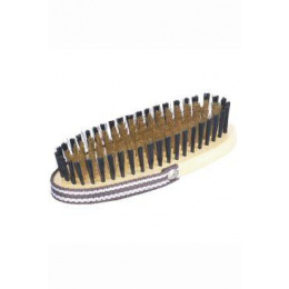 Dřevěný oválný kartáč na ruku s mosaznými drátky uprostřed je určený na úpravu srsti malých zvířat.