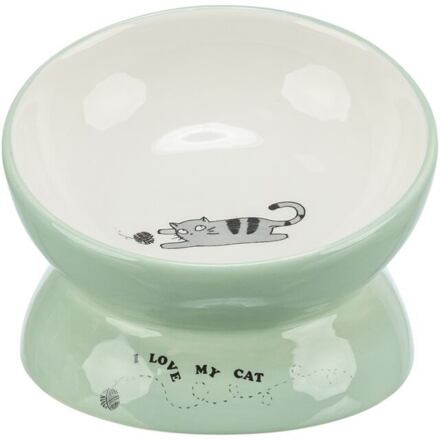 Keramická miska vyvýšená s motívom mačky, ergonomický tvar, 0,15 l / 13 cm, šalvia/biela