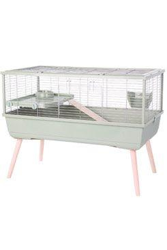 Výbava klece: 1 plastové patro, miska 150ml, jesličky na seno a 1 dřevěné schůdky