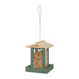 Závěsné krmítko na semena (650g) z certifikovaného borovicového dřeva a kovovým lankem pro větší odolnost. Vrchní plnění přes otvíratelnou stříšku.