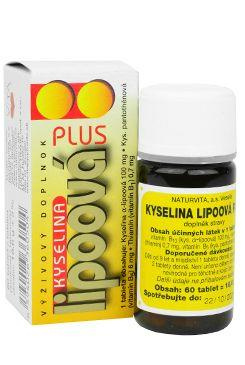 Naturvita Kyselina lipoová Plus je doplněk stravy, který obsahuje kyselinu lipoovou, thiamin (vitamín B1) a kyselinu pantothenovou (vitamín 5).