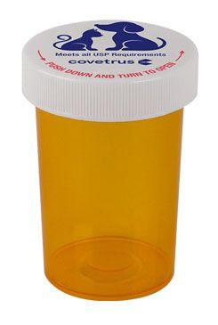 Lékovka plastová Lahvička na léky s dětským bezpečnostním uzávěrem, který je zapotřebí stlačit a otočit. Je označena logem Covetrus s dobře čitelnými pokyny k otevření a s velkou plochou pro označení. Všechny lahvičky mají na uzávěru pro větší bezpečnost siluetu psa a kočky, která slouží k označení veterinárních preparátů. Průsvitná janta