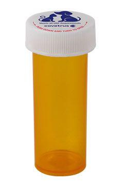 Lahvička na léky s dětským bezpečnostním uzávěrem, který je zapotřebí stlačit a otočit. Je označena logem Covetrus s dobře čitelnými pokyny k otevření a s velkou plochou pro označení.