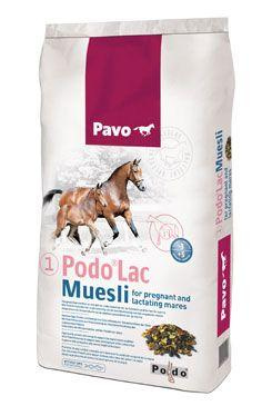 Pavo Podo®Lac Muesli obsahuje velké množství energie pocházející z jedinečného a vysoce cenného zdroje energie = rýžových otrub, doplněných o sójový a lněný olej. Jako vysoce kvalitní zdroj bílkovin byl přidán sójový šrot a sójové vločky. Kombinace vysokého obsahu tuků a kvalitních proteinů zajišťuje klisně udržení zdravé tělesné kondice během březosti a laktace. Kromě toho, vysoké množství kvalitního proteinu v Pavo Podo®Lac Muesli, také podporuje mléčnou produkci a je důležitý pro správný vývoj nenarozeného hříběte.