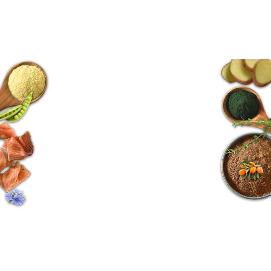 Vykostený losos (25%), zemiakové vločky (18%), sušené bravčové mäso (17%), sušená morka (15%), hrach (12%), hydinový tuk, zemiakový škrob, sušená repná drť (4%), hydrolyzovaná živočíšna bielkovina, kvasnice (3%), vitamíny a minerály, lososový olej (0,5%), psyllium (0,5%), extrakt z yuccy schidigera (0,2%), spirulina (0,2%), ActiveMOS (0,2%), MACROGARD (0,1%), rakytník (0,1%), bylinky (rozmarín, tymián, petržlen, 0,1%), chondroitín sulfát (270 mg/kg), glukosamín sulfát (200 mg/kg).