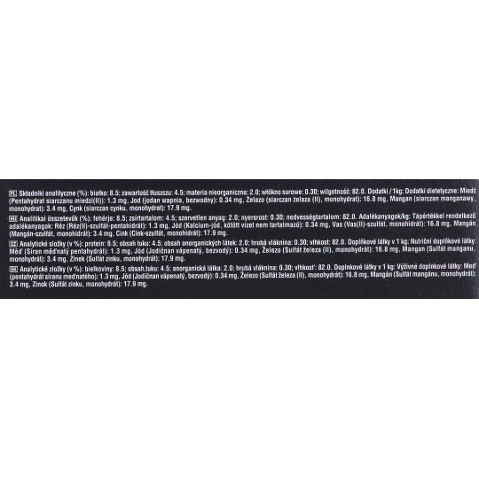 maso a produkty živočišného původu (44 %, z toho 4 % chuťové složky), obiloviny, minerální látky, cukry