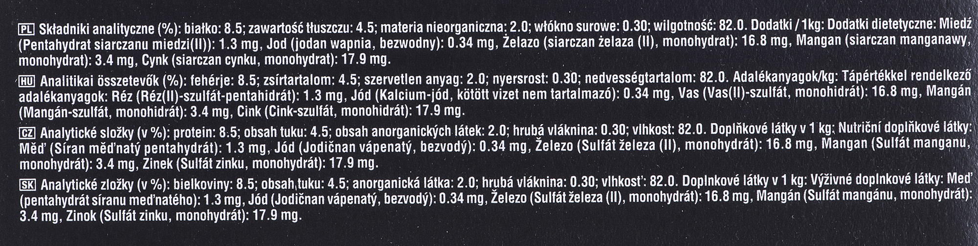 maso a produkty živočišného původu (44 %, z toho 4 % chuťové složky), obiloviny, minerální látky, cukry