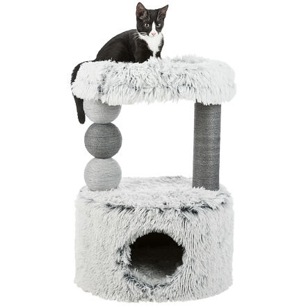 Škrabadlo HARVEY, kukaň, 2 stĺpiky, odpočívadlo 73cm, dlhý plyš, sivá
