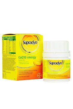 Supradyn CoQ10 energy je multivitaminový doplněk stravy, který obsahuje vitaminy, minerály a stopové prvky se speciálně dávkovaným komplexem vitaminů skupiny B, vitaminu C, hořčíku a vápníku. Kromě vitaminů a minerálů obsahuje také koenzym Q10. Koenzym Q10 je obsažen v každé buňce lidského těla a podporuje přeměnu a využití energie.
