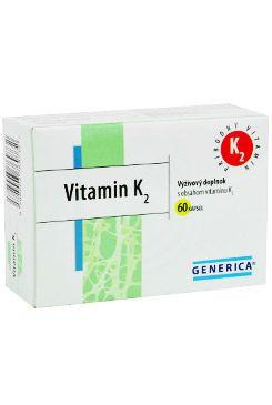 GENERICA Vitamin K2 je doplněk stravy obsahující přirozenou formu vitaminu K2, tzv. izomer MK-7, který se získává patentovaným biofermentačným procesem. Tato forma má lepší biologickou dostupnost a v krevním séru zůstává déle ve srovnání s jinými formami vitaminu K. Pro dosažení maximálního účinku v těle je MK-7 optimálním zdrojem vitaminu K2.