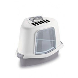 Krytá kočičí toaleta s filtrem do rohu. Součástí balení je lopatka, uložená v horní části toalety.