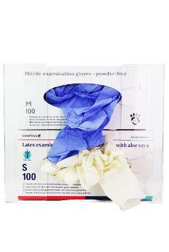 Průhledný akrylový zásobník na rukavice s prohlubní ve spodní části pro snazší vyjímání krabic na rukavice. S předvrtanými otvory pro montáž na stěnu (šrouby nejsou součástí dodávky). K dispozici jsou 3 velikosti: pro jednu, dvě nebo tři krabice na rukavice.